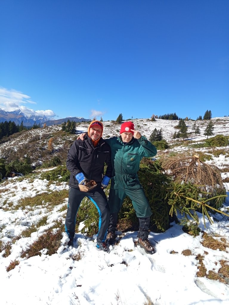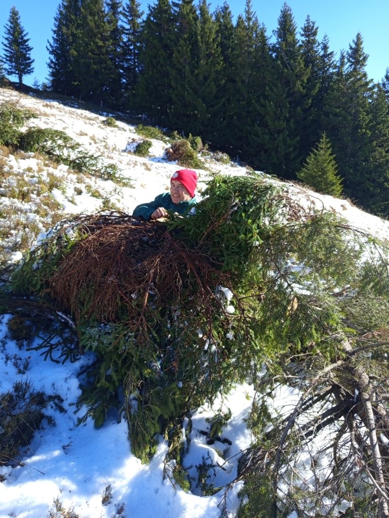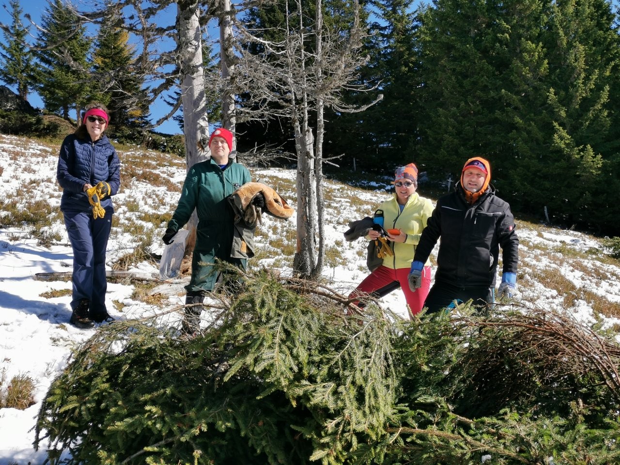 Ko smo prispeli skoraj do koče na Smrekovcu, smo nekaj metrov pod njo dvignili cestno zaporo na levi strani in zavili na tisti dan nekoliko zasneženo in poledenelo pot. Po 10 minutah vožnje od zapore smo avtomobile parkirali in se odpravili proti kapelici na Komnu, kamor smo morali prispeti do 9. ure, ko je bil zbor udeležencev akcije. Po hladnem jutru in dokaj strmem vzponu nas je na vrhu pričakalo sonce in z veseljem smo čez nekaj časa pozdravili preostale udeležence, predvsem pa Petra Tomšeta, podpredsednika NZ Smrekovec in člana PD Črna na Koroškem, ki je bil glavni koordinator akcije od samega začetka. Potrebno je bilo veliko usklajevanja med raznimi deležniki s področja varstva narave, gozdarstva itd., saj gre za poseg v zaščiten prostor, in Peter je vso zadevo pripeljal do možne izvedbe. Med udeležence čiščenja, okrog 20 se nas je zbralo, je razdelil ustrezne delovne rokavice, s preostalimi Korošci pa je do kapelice prinesel tudi sendviče in pijačo za vse udeležence akcije. Že dosti časa pred nami še v primernem vremenu so prostovoljci pašne skupnosti, PD Ljubno in Lovske družine Ljubno ob Savinji požagali drevesa in grmičevje smreke, danes pa smo se člani PD, vpetih v NZ Smrekovec, še z nekaterimi drugimi prostovoljci razkropili po pobočju Komna in nažagano smrečje spravljali na posamezne kupe. Postorili smo veliko, je pa zaradi zapadlega snega bilo delo oteženo in roke postopoma premočene, po opoldnevu pa je že marsikoga pošteno zazeblo zaradi vetra in z delom smo počasi končali, čeprav je na terenu še ostalo nepospravljeno nažagano smrečje. Malica je dobro dela, malo smo se podružili in se nato v skupinah podali na tri različne poti do izhodišč, tako kot smo prišli, s Petrom pa sva pobrala še smeti in jih vsak v eni vreči odnesla v dolino. Naša šaleška skupina se je ustavila še v koči na Smrekovcu, preden sem odpeljal Mitjo in Vero v dolino do parkirišča pred Ipponom ter Lučko v Velenje. Doma sem zaradi blatnega cestišča potreboval še nekaj časa, da sem očistil avto do mraka, med nas markaciste pa sem kmalu razdelil še 3 pare opranih in posušenih rokavic, ki so ostale pri kapelici po končanem delu.