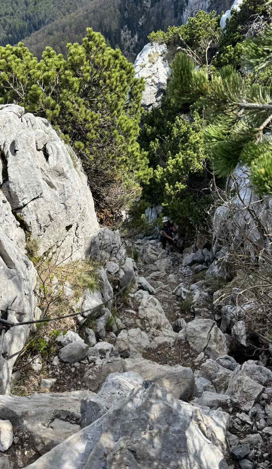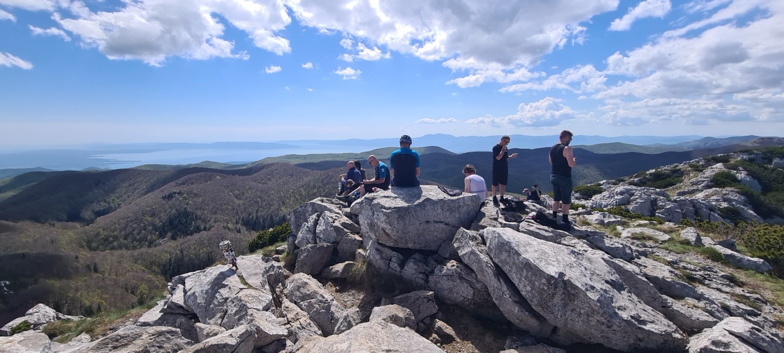 Po nekaj metrih je asfaltno podlago zamenjala utrjena gozdna pot, ki pa se je že v začetku strmo vzpela vse do Medvedjih vrat. Tu pa se je veselje šele začelo. Konkretna strmina grobega kamenja in ozke poti je zahtevala, da smo nemalokrat sestopili s koles in le-te »potišali« v neusmiljen klanec. In nekako tako je izgledala sicer čudovita pot med mogočnimi drevesi. Nekje 10 minut pred Schlosserjevim planinskim domom smo ob poti zložili kolesa ter se peš povzpeli do zeleno odetega Schlosserjevega travnika, ki se nahaja pod mogočnim skalovjem Velikega Risnjaka. No, ker naši turno kolesarski izleti včasih niso samo to, smo dobesedno poplezali do mogočnega vrha, ki je ponudil fenomenalen razgled na Kvarner ter vrhove Gorskega Kotarja. Sledil je počitek.